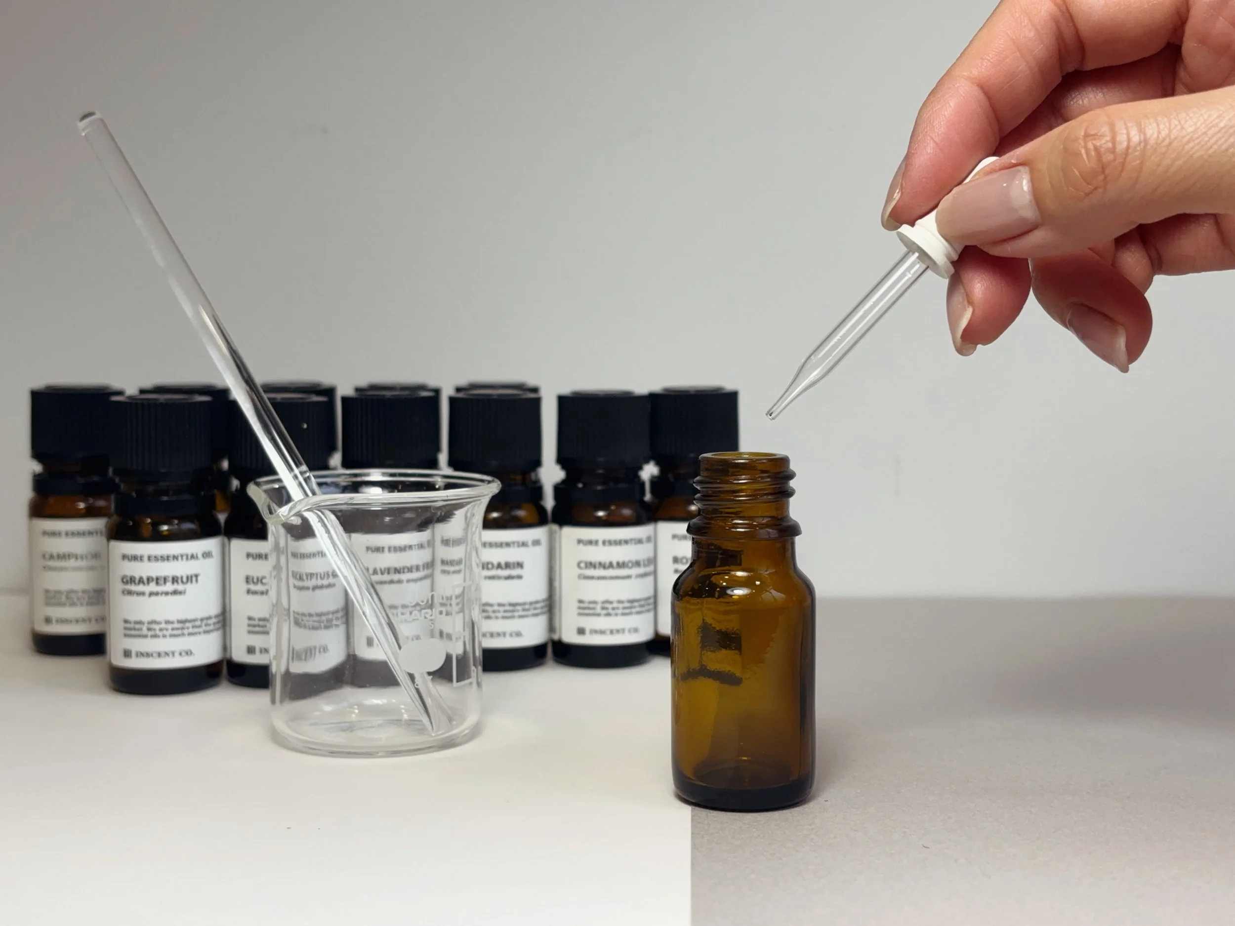30種類の精油の中からお客様とご相談しながら香りを選び、オリジナルのアロマブレンドを製作いたします。完成した香りでルームスプレーやロールオンアロマなどにしてお渡しします。¥5,500 〜